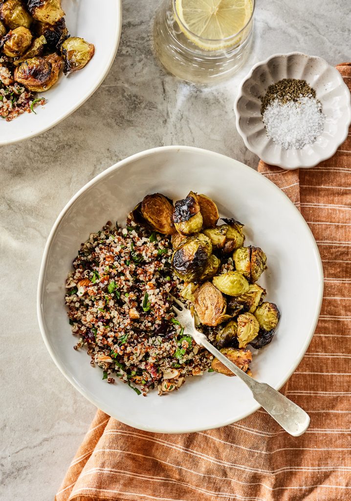 - Répartir les choux de Bruxelles dans les 6 assiettes, arroser de vinaigrette et saupoudrer de quinoa croustillant.