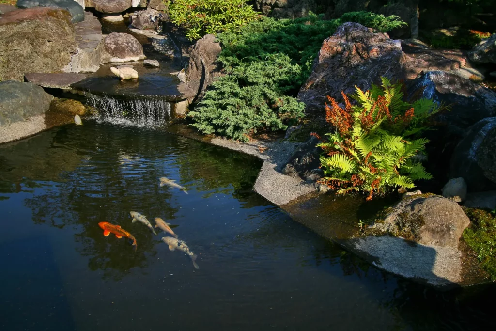 Vous pouvez mettre dans la mare des animaux (tortues, carpes koï, …) et des plantes comme des nénuphars.