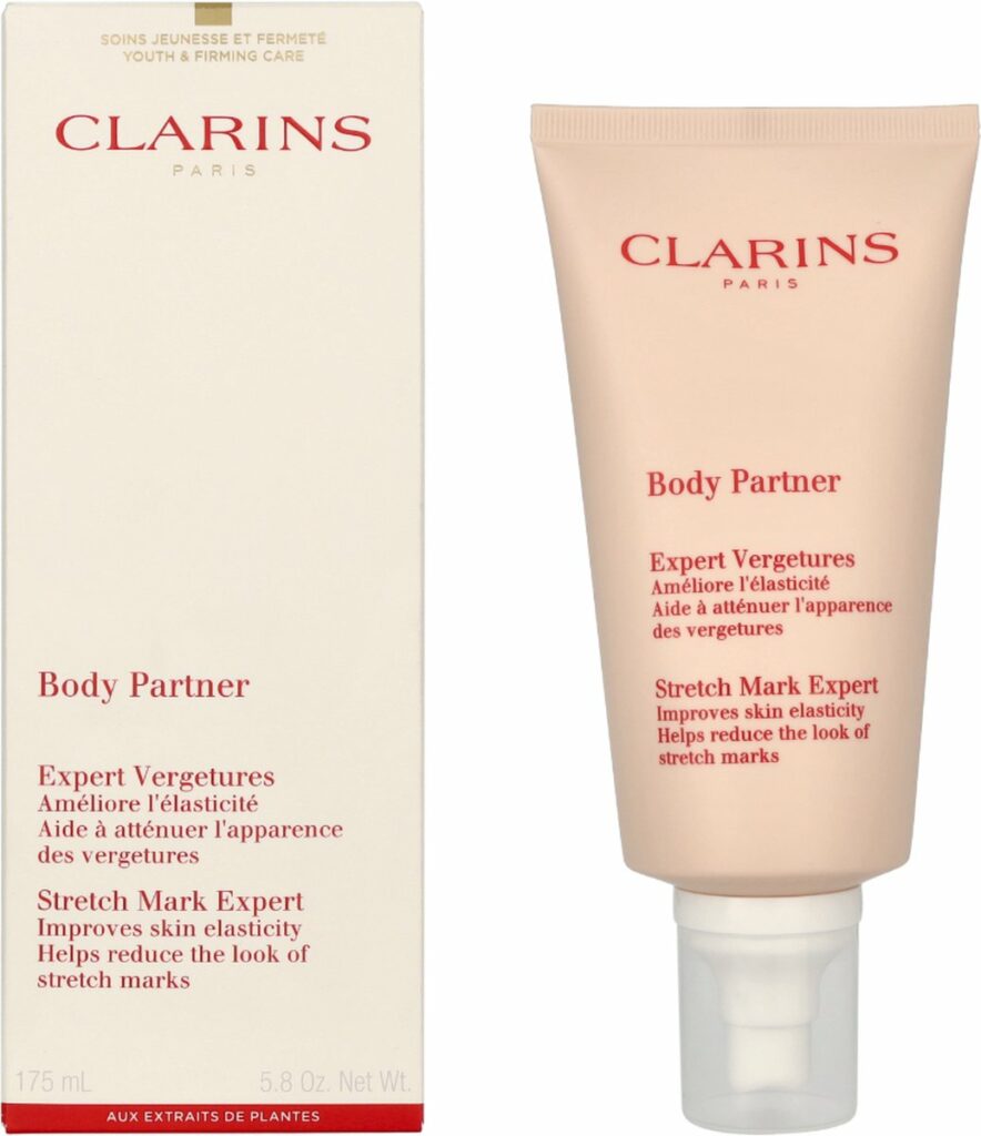 - Body Partner expert vergetures de Clarins vendu au prix de 60 € pour 175 ml. Un mélange de Centella asiatica et de banane verte bio, capable de renforcer les fibres de collagène et d’élastine pour prévenir l’apparition des vergetures.