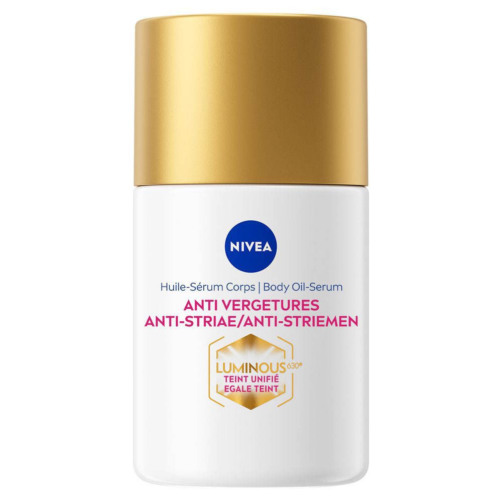- Huile-Sérum antivergetures de Nivea vendue au prix de 12,90 € pour 100 ml. Alliant des huiles à l’actif antitaches Luminous630, ce soin prévient l’apparition et réduit la visibilité des vergetures.