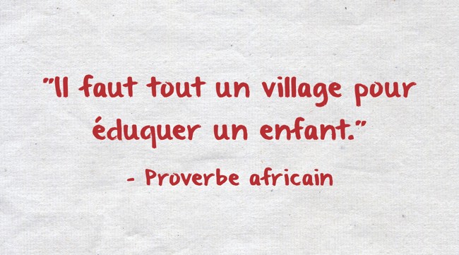 Ce proverbe indique l’importance d’un réseau dans l’éducation des enfants, que ce soient la famille, les ami(e)s ou les voisin(e)s.