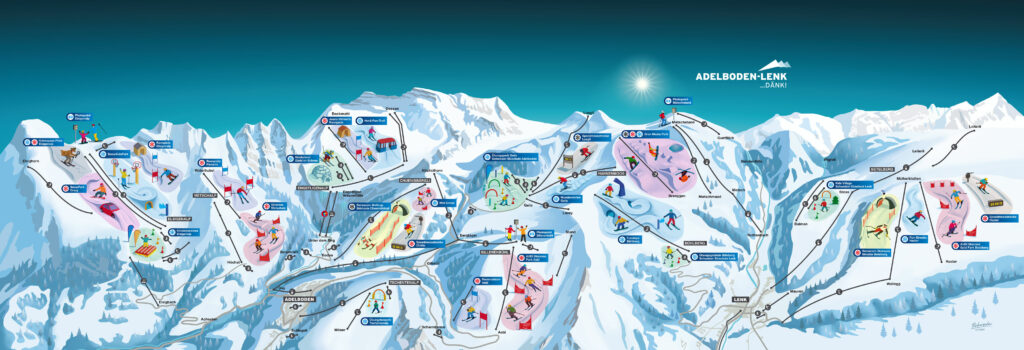 Le cœur du domaine se situe entre Adelboden et Lenk, mais le domaine skiable Adelboden-Frutigen-Lenk s’étend également :