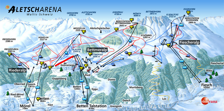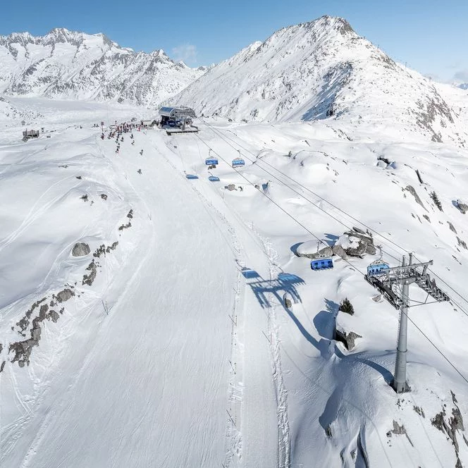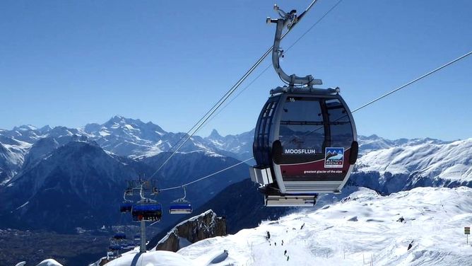 Le domaine skiable Aletsch Arena est directement accessible depuis les villages de Bettmeralp et Riederalp, deux endroits que l’on atteint en prenant le télécabine plus bas dans la vallée, du côté de Mörel.