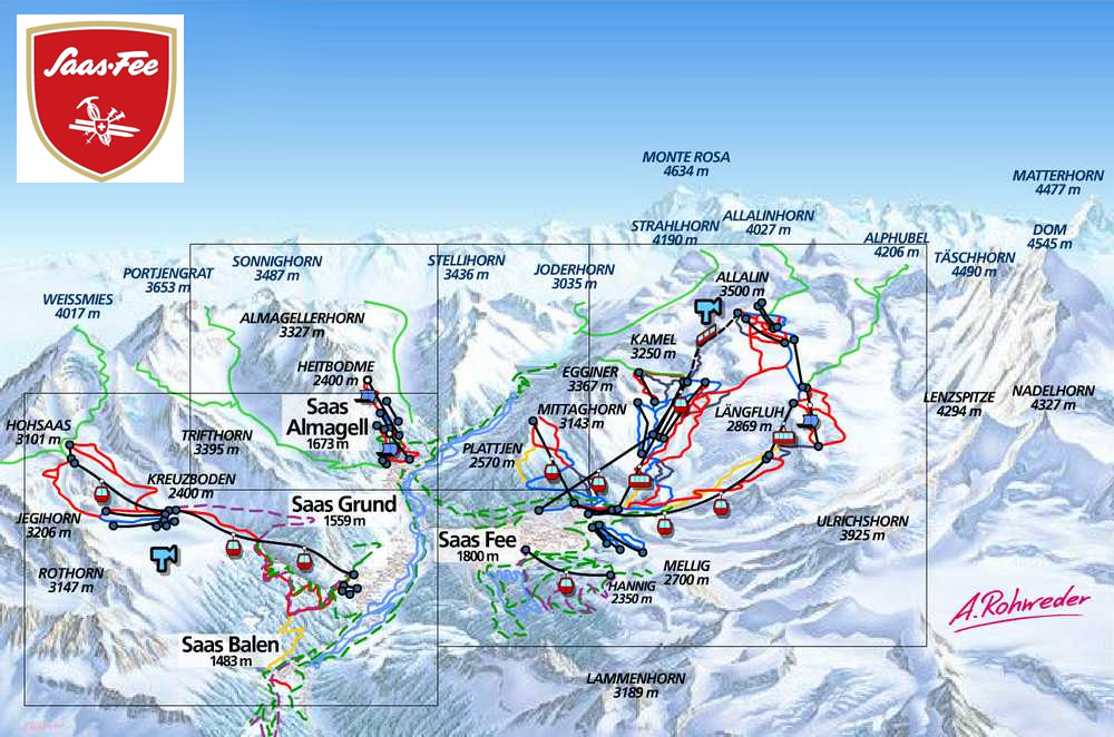 Le domaine skiable de Saas-Fee est réparti sur plusieurs secteurs reliés par des télécabines, des sièges débrayables et des téléskis.