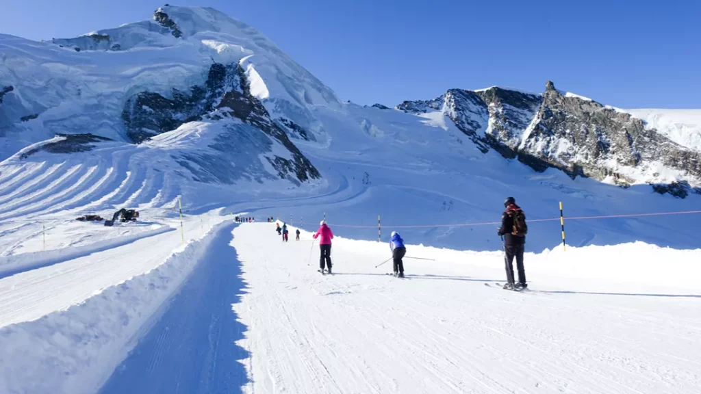 Le secteur du glacier de l’Allalin, accessible via le funiculaire souterrain Metro Alpin, offre des pistes larges et bien enneigées, idéales pour les skieurs intermédiaires.