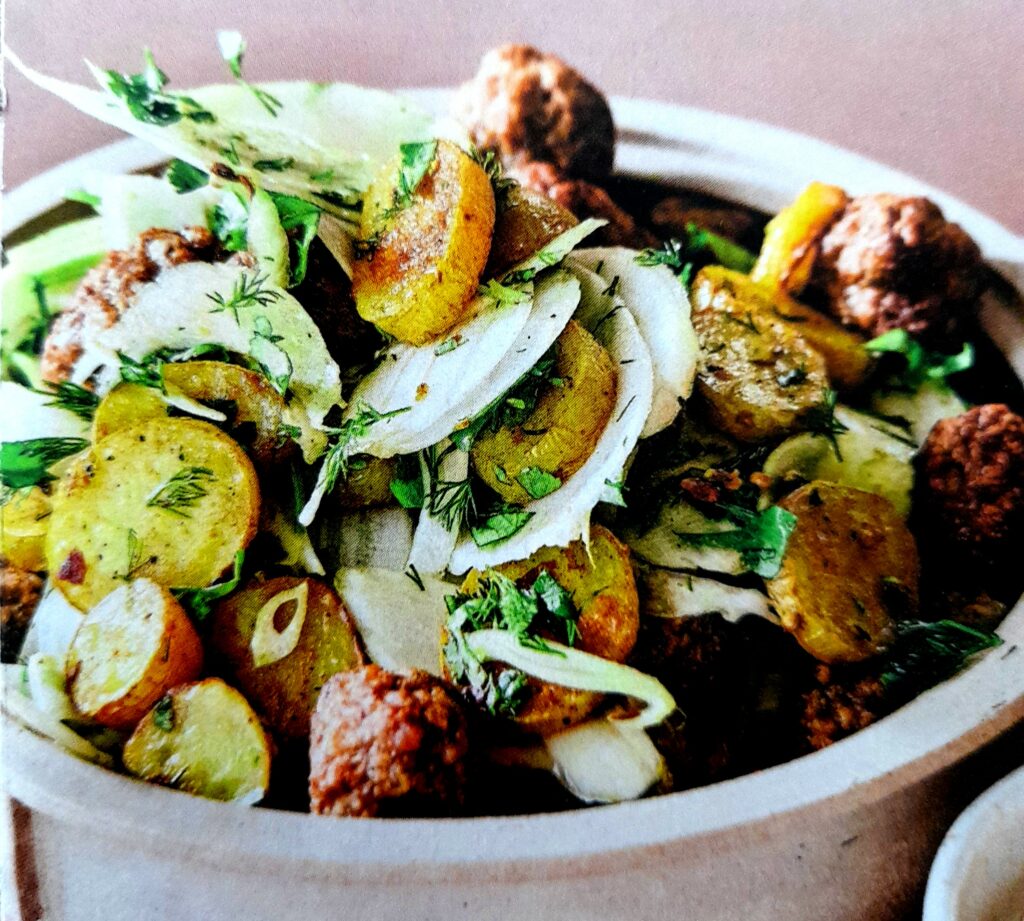 - Mélanger les pommes de terre sorties du four avec les herbes ciselées, le fenouil, 3 cuillères à soupe d’huile, sel et poivre.